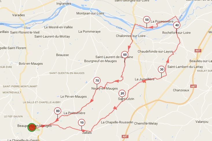 A : Beaupréau – Jallais – St Lezin - La Jumelliére – St Aubin de Luigné- Rochefort- Savenniéres – la Poissonniére – Chalonnes- Croisement de la Germoniére – Neuvy – la Poiteviniére – Beaupréau.