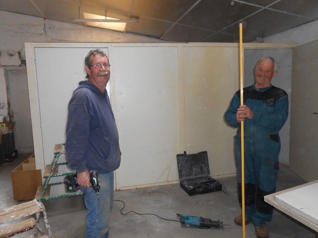C'est parti...............les premiers coups de perceuse et de scie sont donnés pour rénover les locaux du fond. La cave sera tranférée à droite et l'autre partie sera aménagée en lieu de stockage. Vous pouvez admirer nos deux ouvriers en tenue. René interviendra par la suite pour donner un coup de peinture.